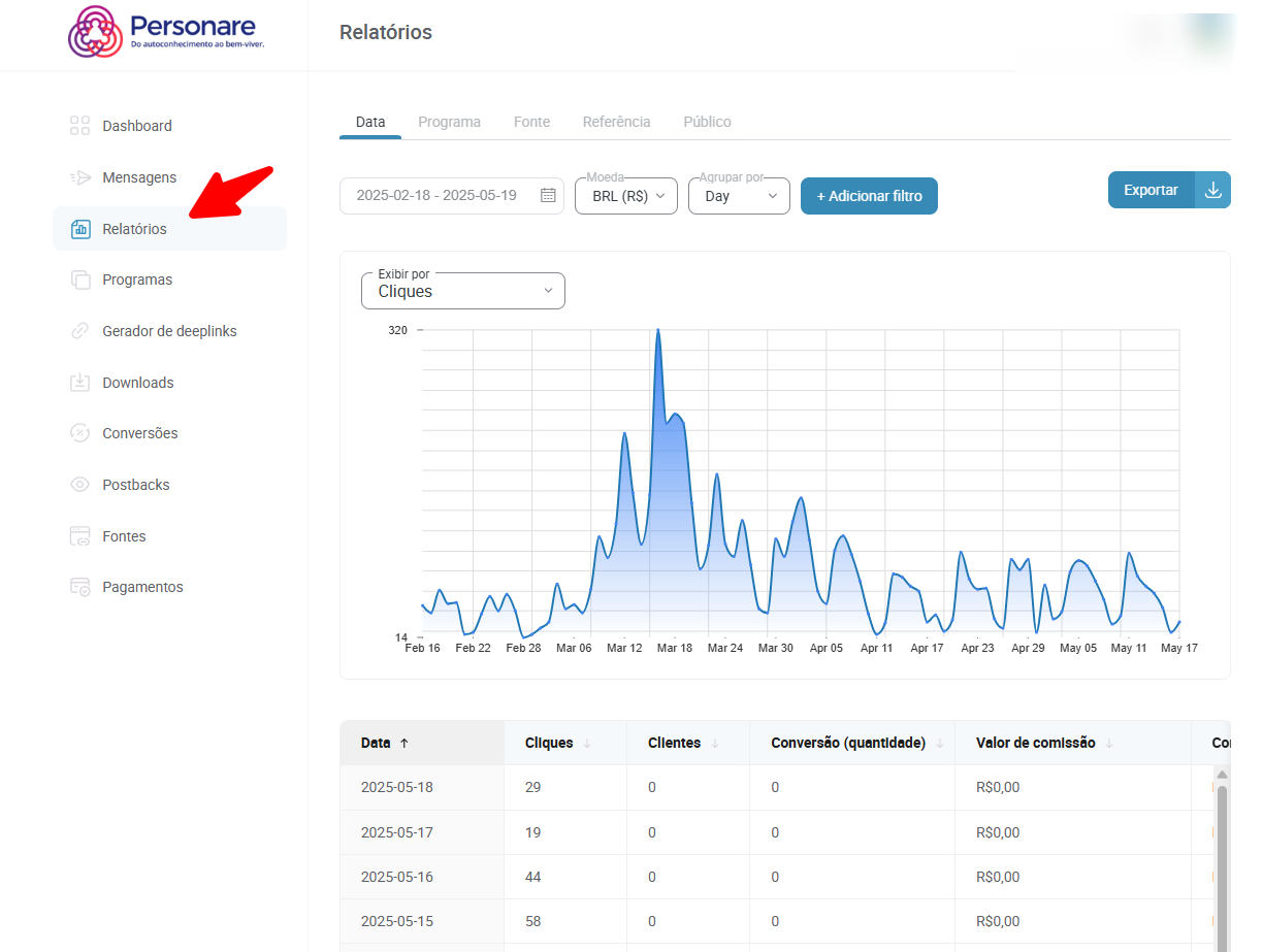 No painel Sistema de Afiliados Personare, você pode gerar relatórios detalhados sobre o desempenho das suas campanhas. Basta acessar a seção "Relatórios" para escolher o período desejado, visualizar os cliques, as conversões e as comissões associadas. Esses relatórios ajudam a acompanhar sua performance e a otimizar suas estratégias.